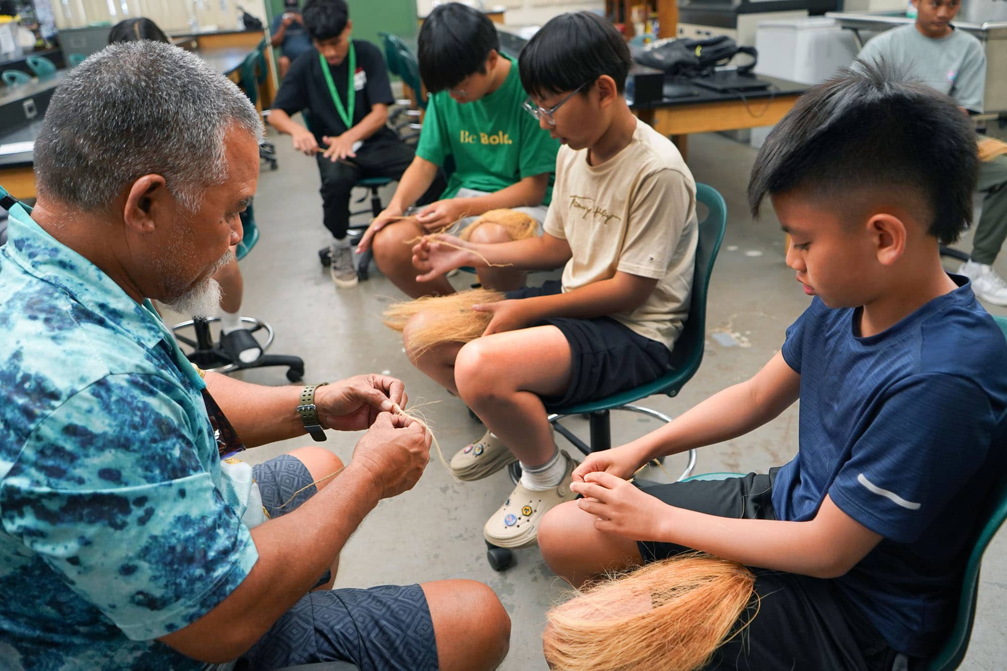 of Guam, teaches 4-H participants how to make rope from dried coconut husks during