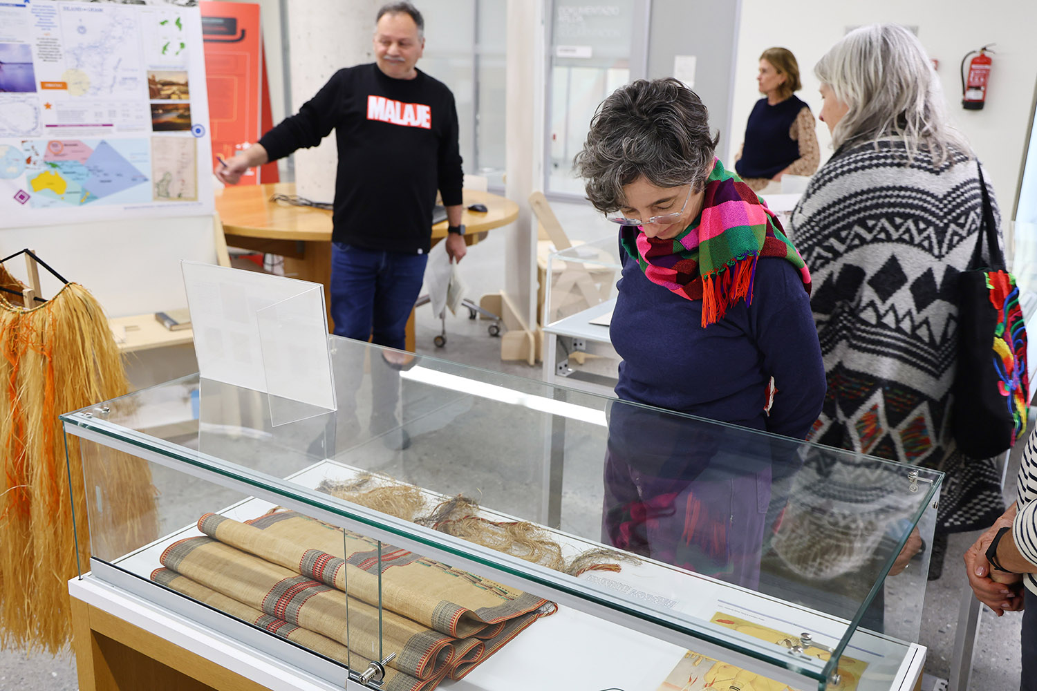 Beatriz Moral (center), curator of the exhibit, looks at artifacts from Yap given to Del Valle in the 1970’s.