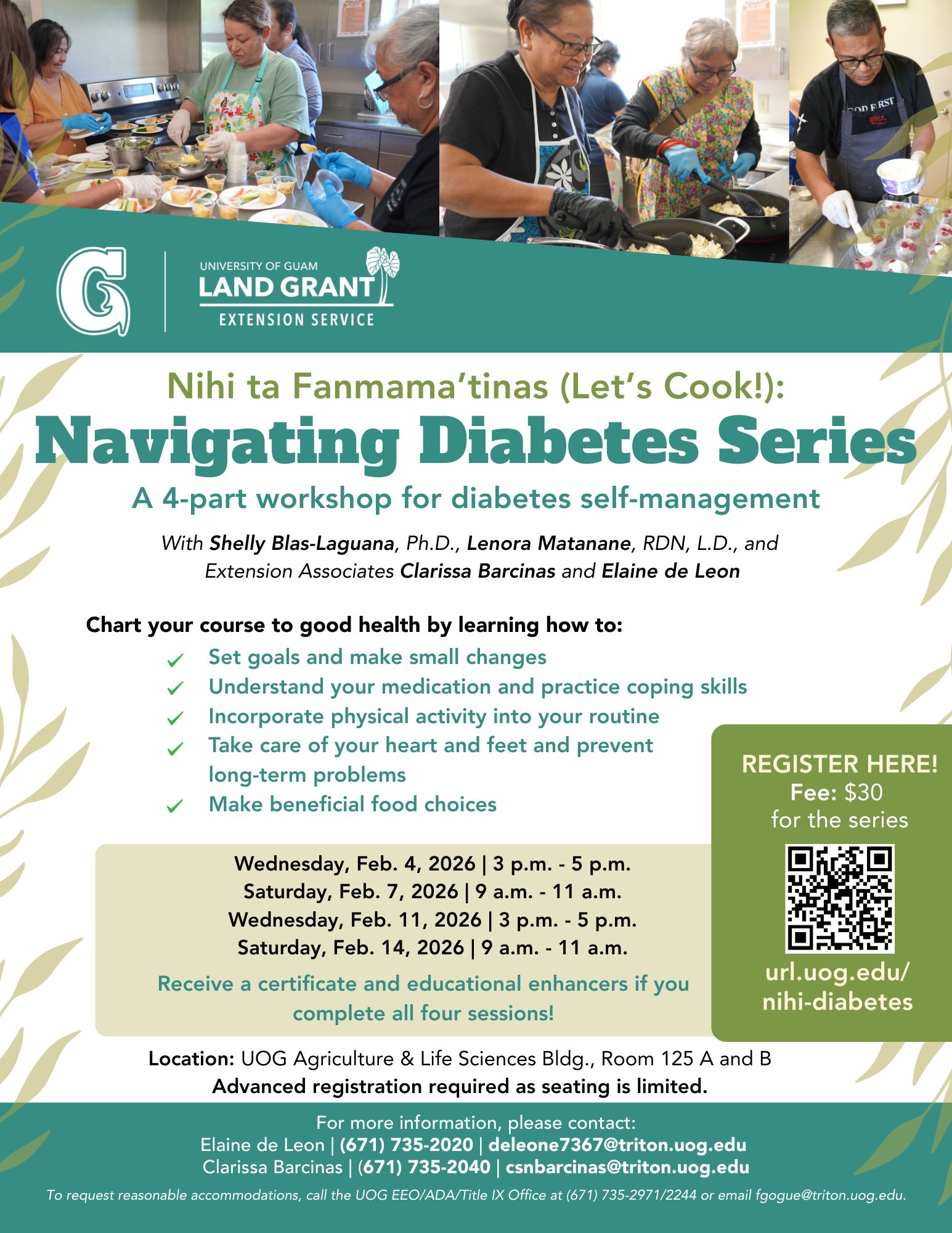 People with diabetes and their caregivers are invited to a four-session workshop on diabetes self-care with the University of Guam Land Grant Extension Service. The Nihi ta Fanmama’tinas (Let’s Cook) Navigating Diabetes Series will be held from 3 p.m. to 5 p.m. on Wednesdays and from 9 a.m. to 11 a.m. on Saturdays from Feb. 4 to 14 at the UOG Agriculture & Life Sciences Bldg.