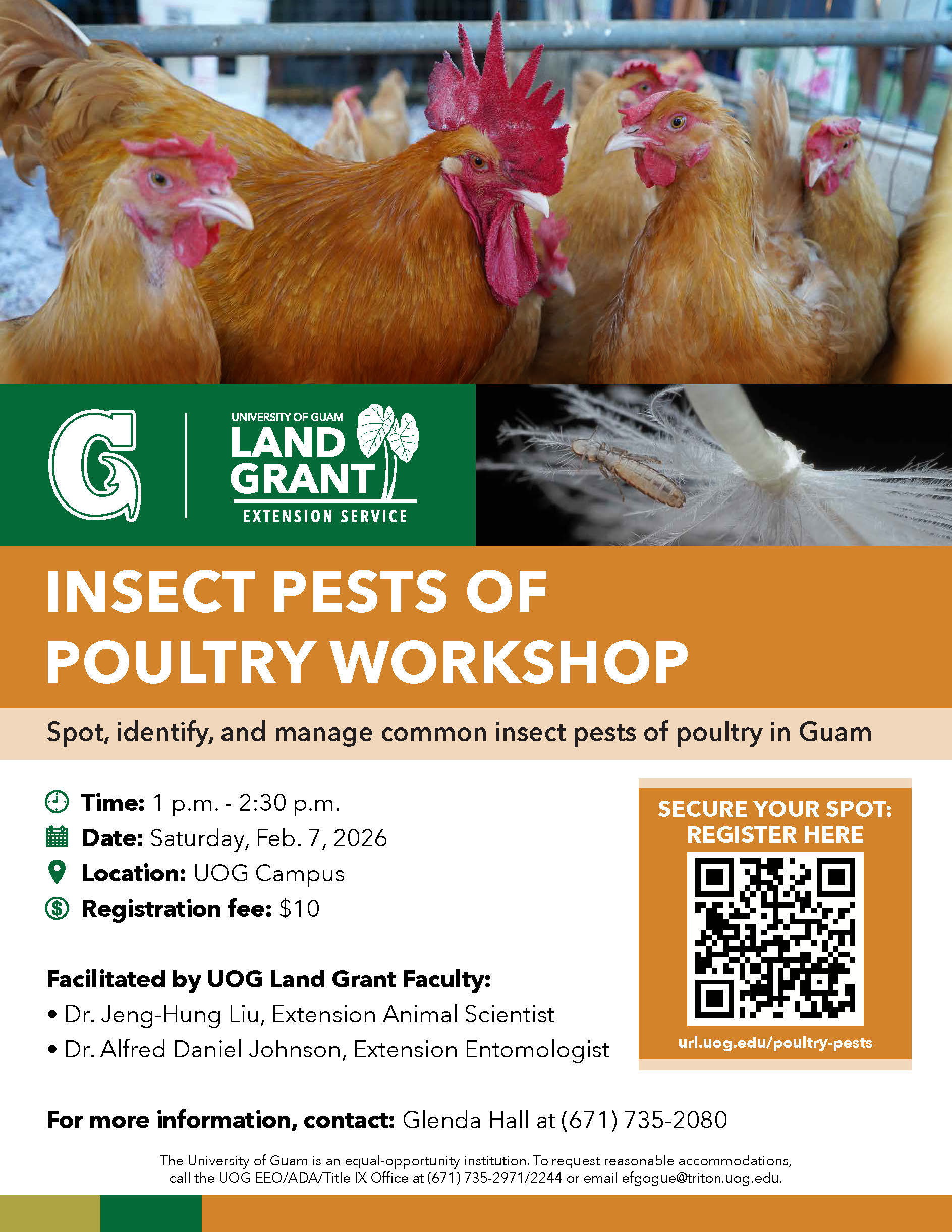 The workshop has a $10 registration fee. Interested participants can register at https://url.uog.edu/poultry-pests. For more information, contact Glenda Hall at (671) 735-2080.