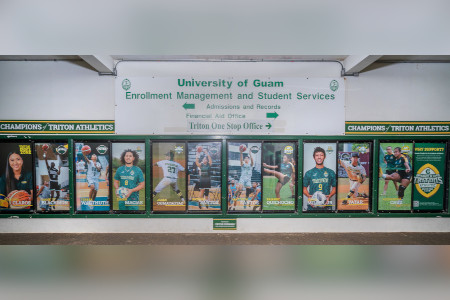 The wall, located in the UOG Calvo Field House, features the top Triton athletes from each sport.