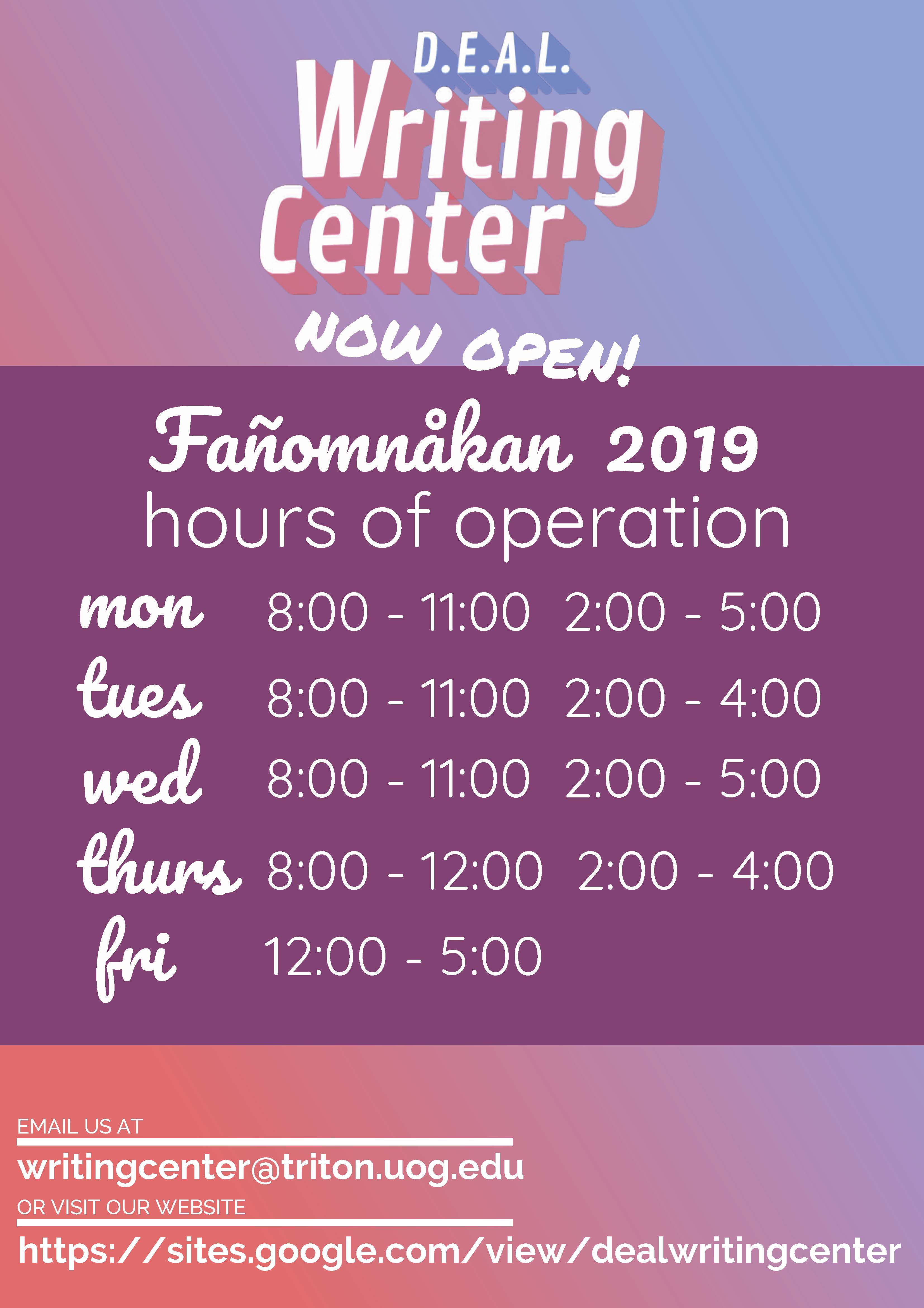 The University of Guam's Division of English and Applied Linguistics (DEAL) Writing Center is a tutorial resource run by students for students and is funded by course fees from those enrolled in composition classes. The main goal of the Writing Center is to help students become better writers.