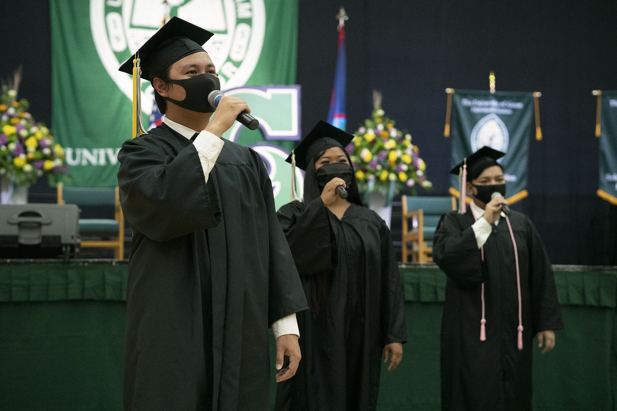 The ceremony was held virtually due to safety precautions with the COVID-19 pandemic. Nearly 1,000 people tuned in live for the ceremony on Facebook, and the video has had 32,000 views overall. Following a processional, anthems, invocation, and speeches that were recorded on a decorated stage in the Calvo Field House, each graduate’s name was called while their graduation photo and title of their degree showed on screen.
