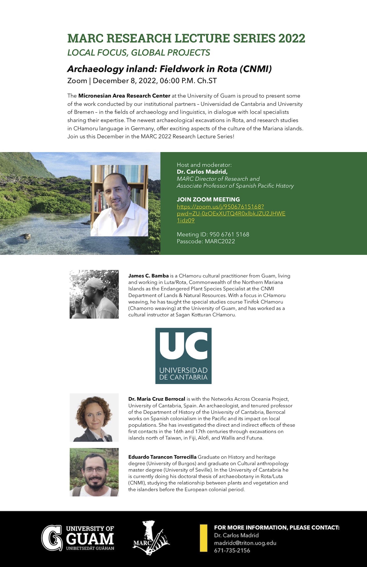 The Micronesian Area Research Center at the University of Guam is proud to present some of the work conducted by MARC institutional partners – Universidad de Cantabria in Spain and University of Bremen in Germany. Their work covers the fields of archaeology and linguistics, in dialogue with local specialists sharing their expertise.