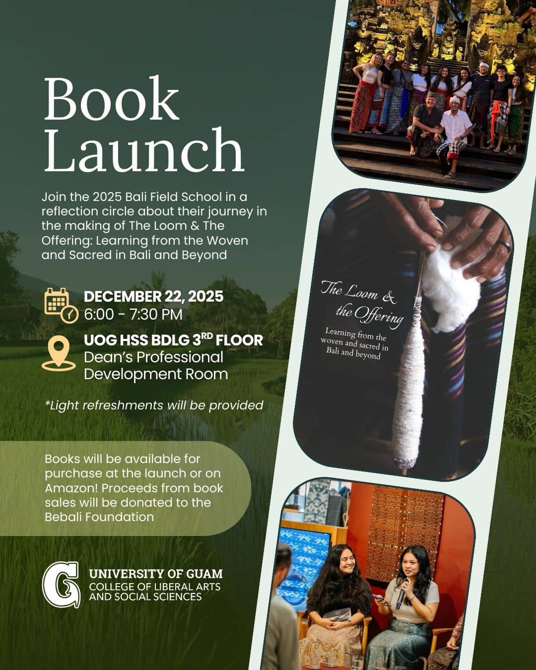 The University of Guam community will celebrate a milestone in global learning and student scholarship with the local launch of The Loom and the Offering: Learning from the Woven and the Sacred in Bali and Beyond at 6 p.m. on Monday, Dec. 22, in the Dean’s Professional Development Room on the third floor of the Humanities and Social Sciences Building.