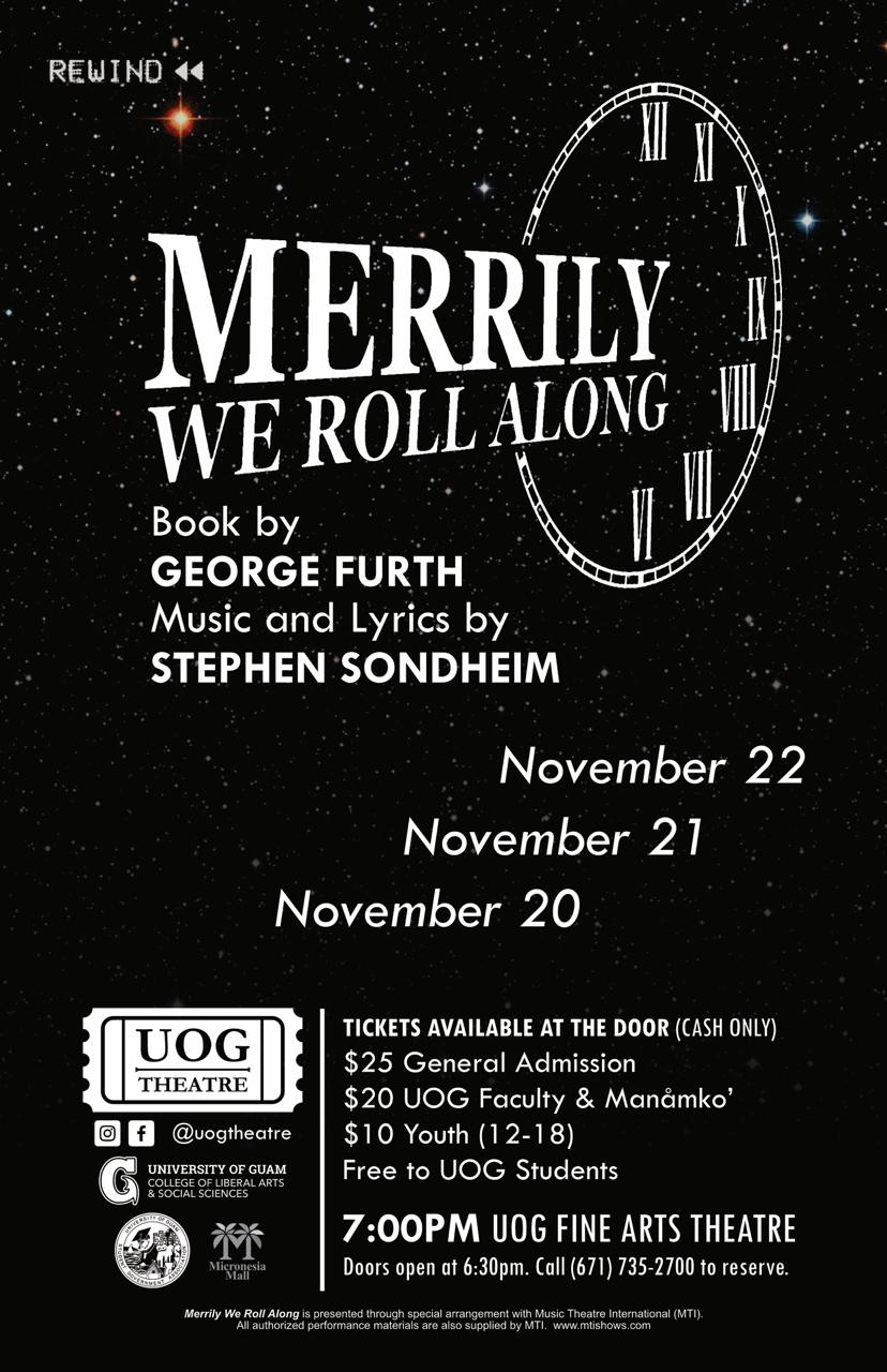 The University of Guam Theatre and Music programs proudly present Merrily We Roll Along, the Tony Award Winning musical with music and lyrics by Stephen Sondheim and a book by George Furth. The production will run for three nights only on November 20, 21, and 22 at 7:00 p.m. at the UOG Fine Arts Theatre, with doors opening at 6:30 p.m. each evening.