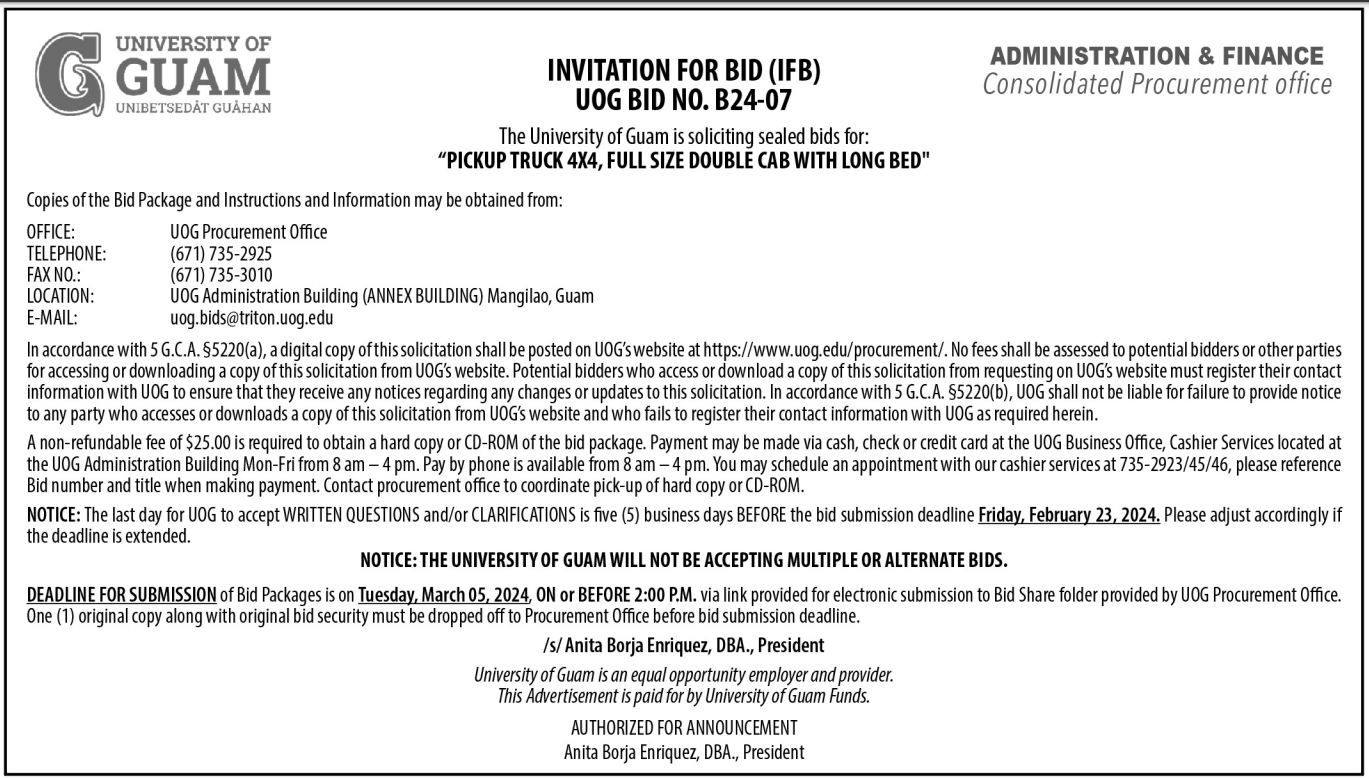 - All correspondences regarding any IFB/RFP should be addressed to uog.bids@triton.uog.edu.