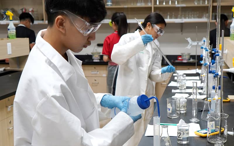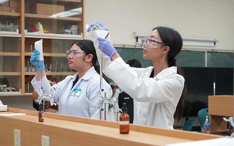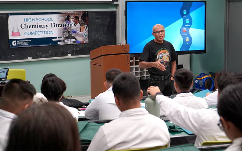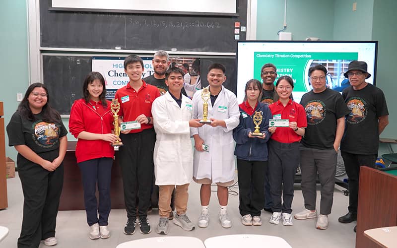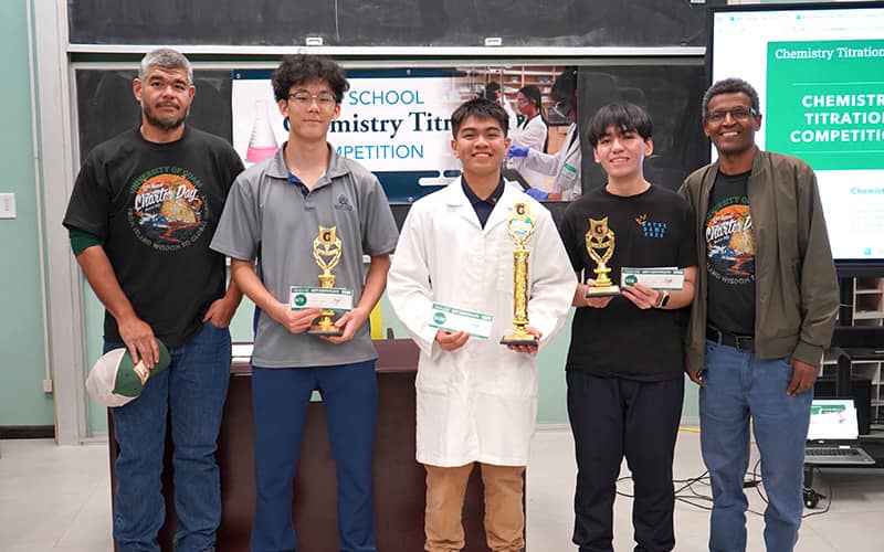 The Division of Natural Sciences under the College of Natural & Applied Sciences hosts a Chemistry Titration Competition for high school students annually during the University of Guam's Charter Day. The competition involves a two-part experiment that requires teams of two students to determine the concentration of a base and the mass of an acid through titration, or volume measurement. UOG chemistry majors judge the competition, and participants earn points for accuracy and precision of their data.
